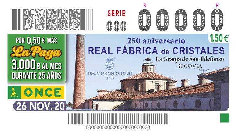 Presentación del cupón que desde ONCE se dedica a la Real fábrica de Vidrio de la Granja de San Ildefonso, En el Acto estarán presentes, representantes de ONCE, Directivos de la Real Fábrica, y el Alcalde del Real Sitio de San Ildefonso. El edificio de la Real Fábrica de Cristales de La Granja, declarado Bien de Interés Cultural, es uno de los edificios industriales más importantes de la Europa de la Ilustración, fue mandado construir por el soberano Carlos III, de acuerdo a los planos del aparejador del Real Sitio, Joseph Díaz Gamones, el 19 de noviembre de 1770.