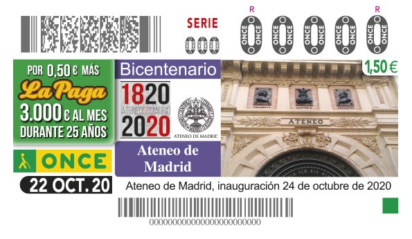 La ONCE entregará una reproducción del cupón que se emitirá día 22 de octubre de 2020 con motivo del Bicentenario del Ateneo de Madrid a su presidente