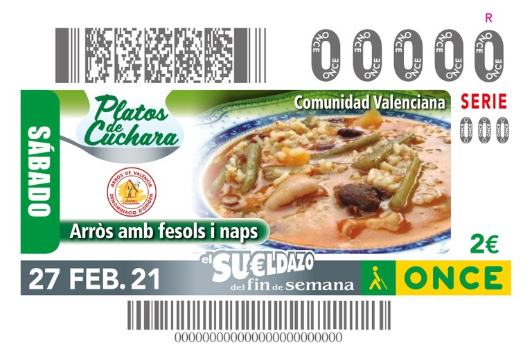 Presentación del Cupón de la ONCE, que dentro de la serie "Platos de cuchara" hace alusión a la gastronomía de Valencia con el "arrós amb fesols i naps". Este cupón corresponde al sorteo del sábado 27 febrero.