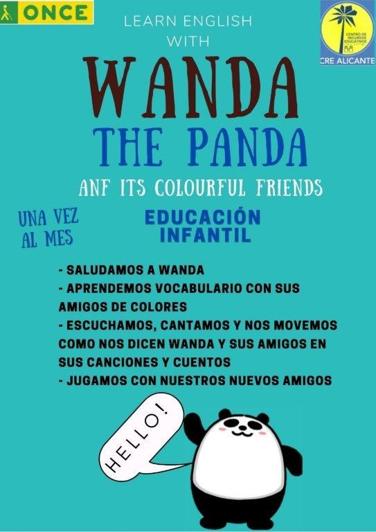 - Taller virtual para la aproximación de los alumnos/as de educación infantil a una segunda lengua (inglés). Acompañados de la mascota “Wanda the Panda” como elemento motivador y, a través de canciones, juegos y cuentos adecuados al nivel madurativo y características visuales de los alumnnos/as, nos acercamos al vocabulario y expresiones básicas en inglés.
