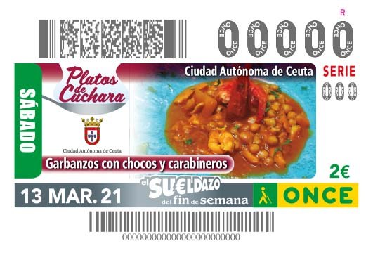 El director de la ONCE de Ceuta, D. Juan Antonio Moreno Pérez, presentará en el Salón del Trono del Palacio de la Asamblea de la ciudad autónoma de Ceuta, al Consejero de Educación y Cultura de dicha ciudad D. Carlos Rontomé Romero, el cupón que la ONCE dedica dentro de la serie "Platos de Cuchara", a los "Garbanzos con chocos y carabineros"
