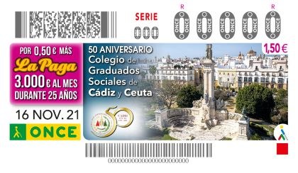 El director de la ONCE de Cádiz y Ceuta D. Alberto Ríos el día 10 de noviembre, presentará en el Salón del Colegio de Graduados Sociales, al delegado territorial de Regeneración, Justicia y Administración Local de la Junta de Andalucía de Cádiz, Excmo. Sr. D. Miguel Rodríguez Rodríguez, y al presidente del Excmo. Colegio Oficial de Graduados Sociales de Cádiz y Ceuta, D. José Blas Fernández Sánchez, el cupón dedicado al “50 Aniversario del Colegio Oficial de Graduados Sociales de Cádiz y Ceuta”.