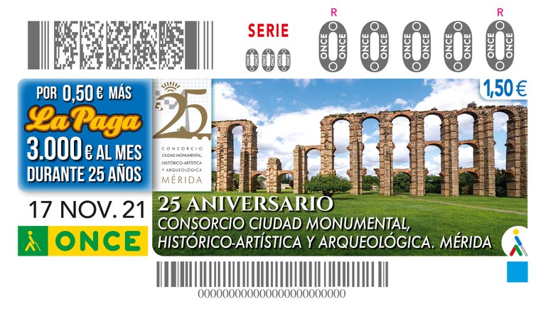 Presentación a los medios de comunicación del cupón conmemorativo del 25º Aniversario de la creación del Consorcio Ciudad Monumental Histórico-Artística y Arqueológica de Mérida, entregando a su Director una lámina enmarcada de este cupón.