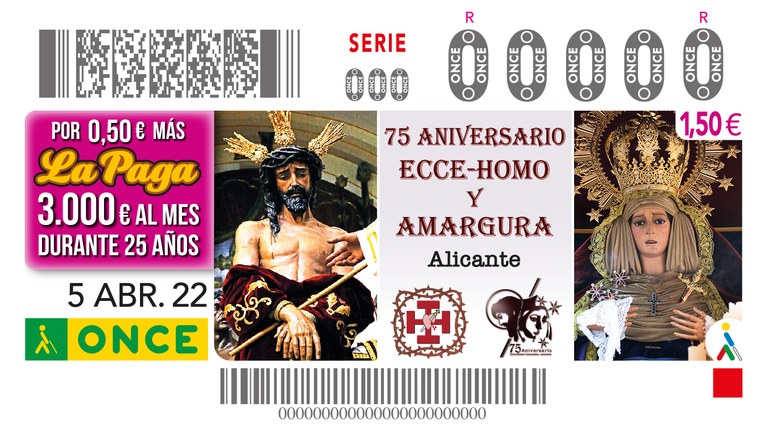 Presentación cupón "75 Aniversario de la Fundación de la Cofradía del Santísimo ECCE-HOMO y Nuestra Señora de la Amargura de Alicante", con fecha de emisión 5 de abril.