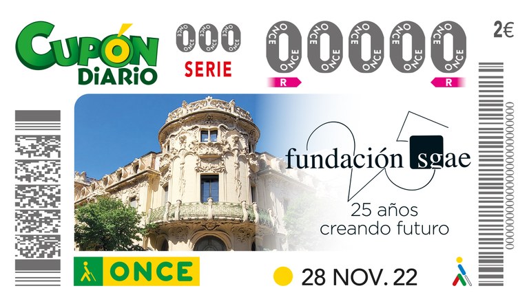 Con motivo del XXV Aniversario de la creación de la Fundación SGAE, esta entidad está realizando diferentes actos conmemorativos y la ONCE se ha unido dedicándole un cupón, fechado el 28 de noviembre.