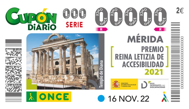 Presentación ante los medios de comunicación del cupón cuyo motivo es Mérida, Premio Reina Letizia de Accesibilidad 2021, concedido por el Real Patronato de la Discapacidad, con entrega al Alcalde de Mérida de una lámina enmarcada de este cupón.