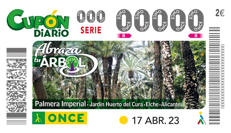 La Palmera Imperial de Elche es el motivo del cupón de la ONCE del lunes, 17 de abril, dentro de la serie ‘Abraza tu árbol’. Este ejemplar se encuentra en el Jardín del Cura de la capital ilicitana.