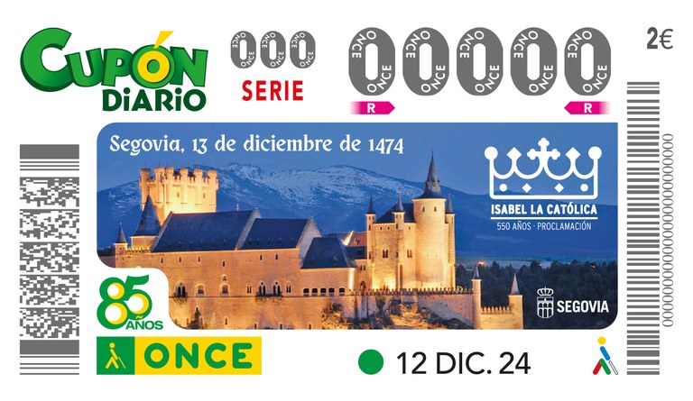 La ONCE dedica su cupón del día 12 de diciembre a la conmemoración del 550º de la proclamación de Isabel la Católica como Reina de Castilla.