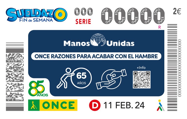 - Con motivo del Aniversario (65 años) de 'Manos Unidas' Grupo Social ONCE se une a los actos conmemorativos con la emisión de un cupón fechado el 11 de febrero.