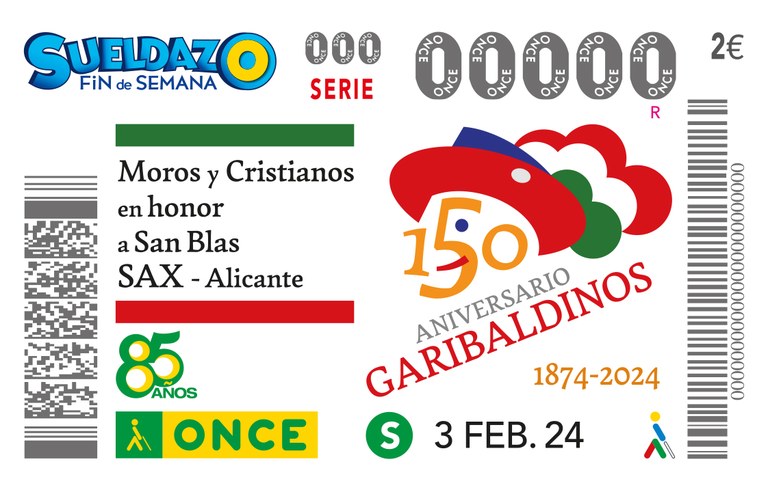 La ONCE dedica su cupón del sábado, 3 de febrero, al 150 aniversario Comparsa Garibaldinos, de Sax.