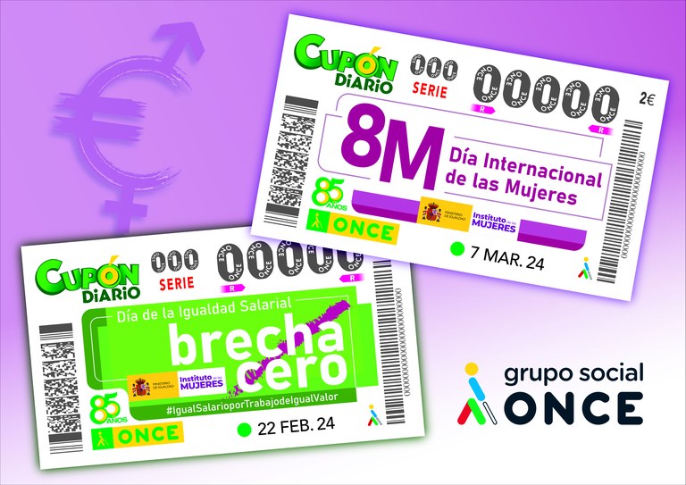 El delegado de ONCE Andalucía, Ceuta y Melilla y la directora de ONCE Granada presentan junto al delegado del Gobierno en Andalucía y el subdelegado del Gobierno en Granada, el cupón dedicado al Día Internacional de las Mujeres, referenciando también el dedicado al Día de la Igualdad Salarial