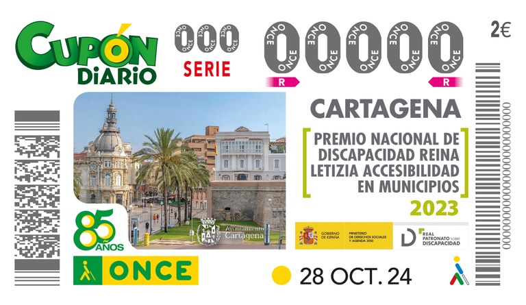 La ONCE dedica su cupón de fecha 28 de octubre a Cartagena, con motivo del reconocimiento al Premio Nacional de Discapacidad Reina Letizia de Accesibilidad Universal de Municipios.