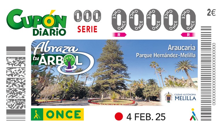 Con motivo de la colección que se ha dedicado bajo el lema 'Abraza tú árbol', el cupón alusivo rinde homenaje al árbol emblemático de la ciudad autónoma de Melilla "Araucaria, Parque Hernández - Melilla"